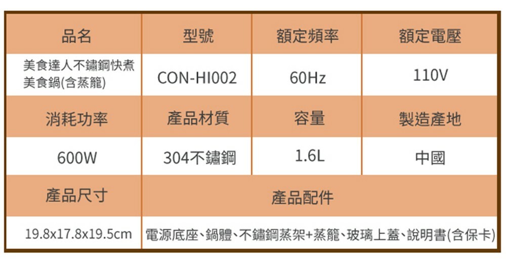電源底座*1、鍋體*1、不鋼蒸架*1、不銹鋼蒸籠*1、玻璃上蓋*1、說明書*1