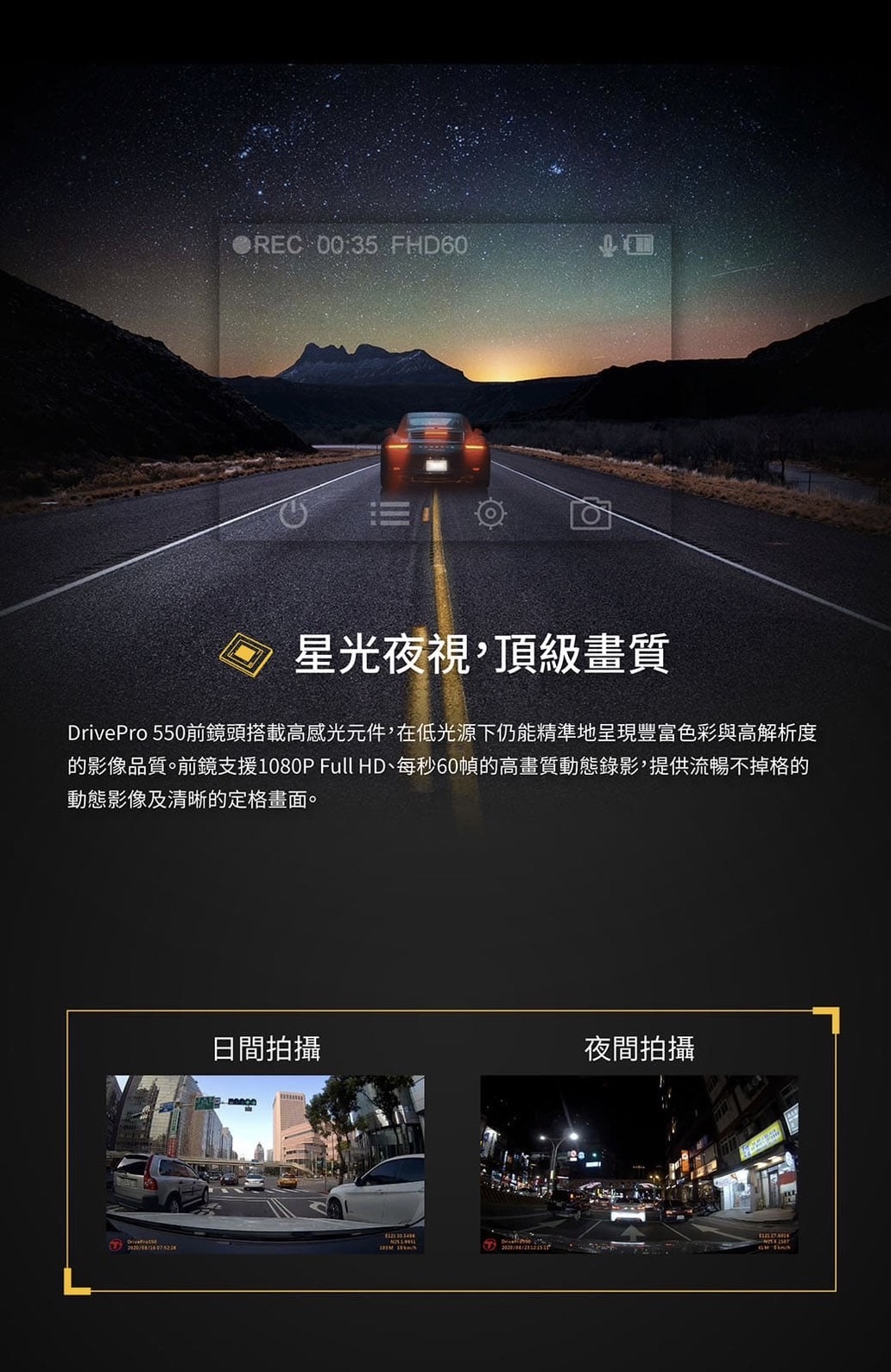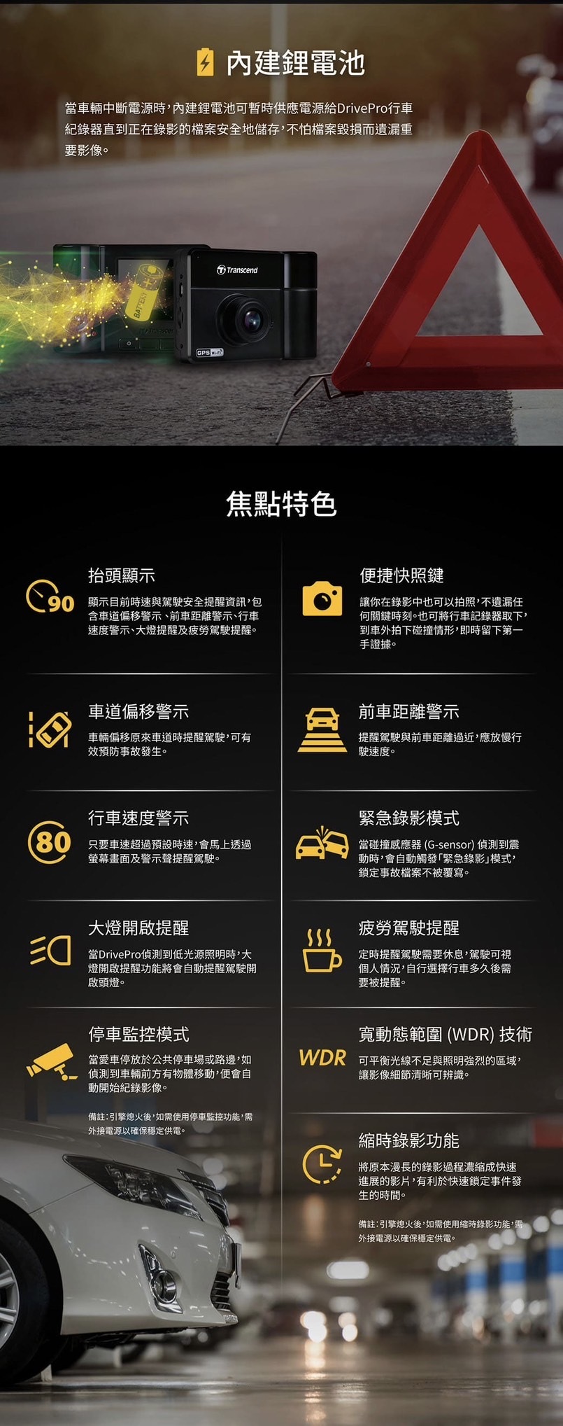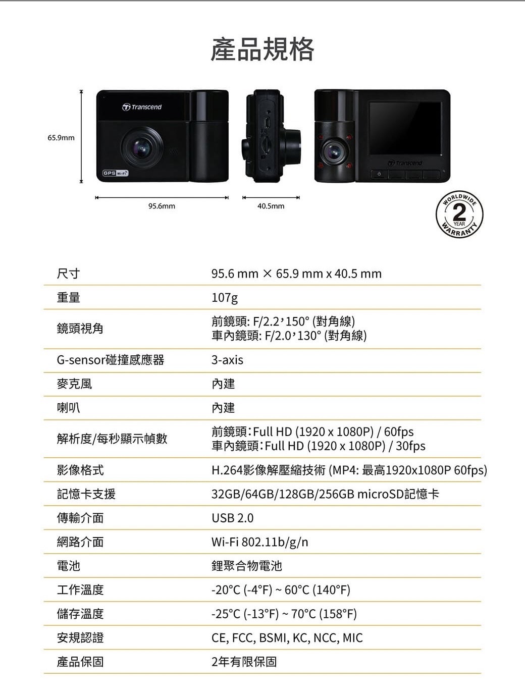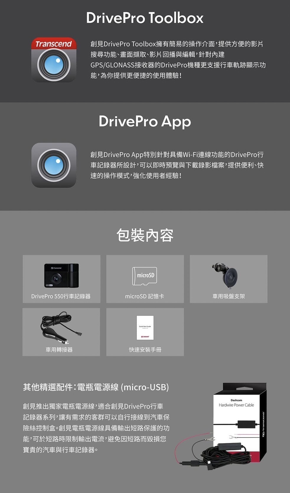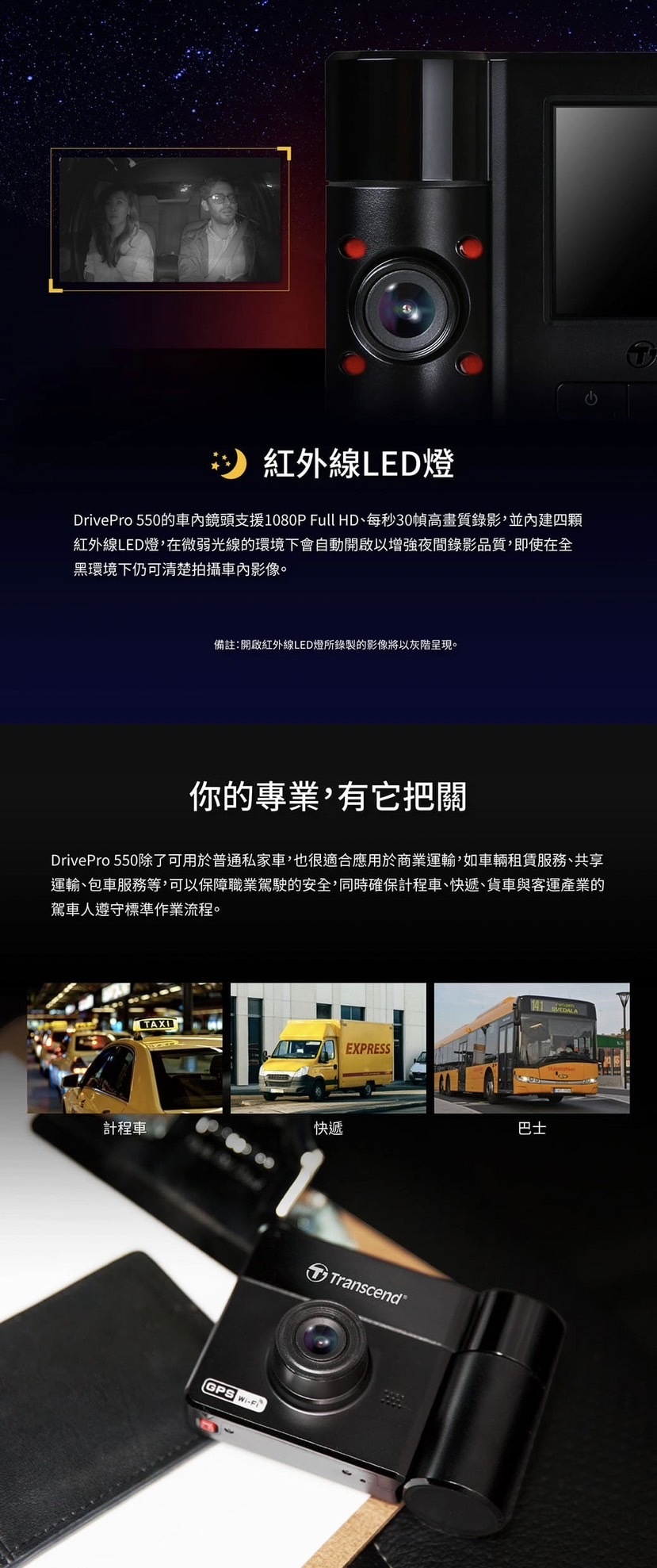 創見DrivePro 550行車記錄器採用一機雙鏡頭設計,打造內外兼顧的行車安全防護。