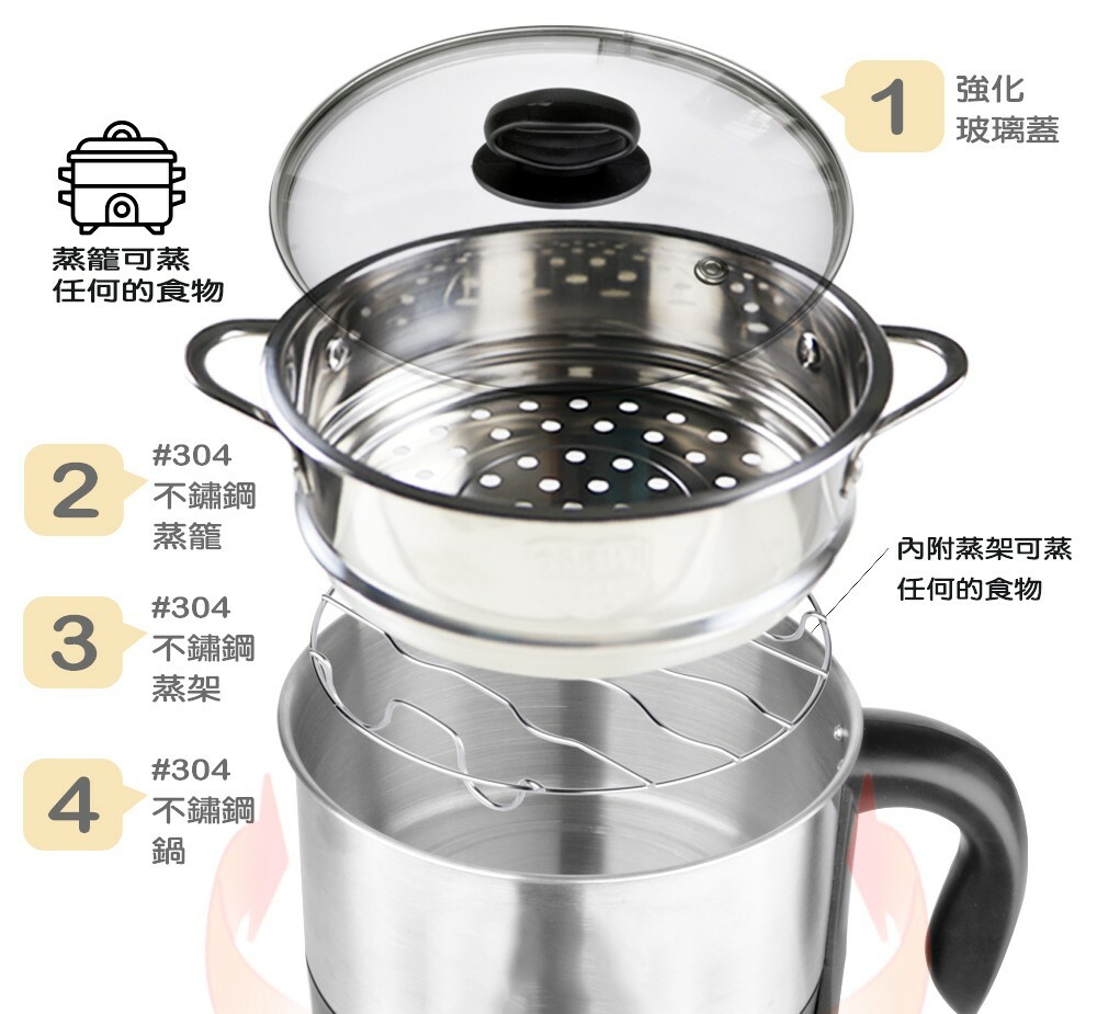 電源底座*1、鍋體*1、不鋼蒸架*1、不銹鋼蒸籠*1、玻璃上蓋*1、說明書*1
