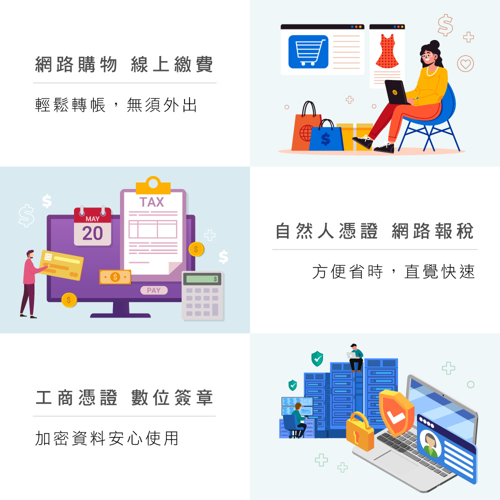 ✔ 可讀取工商憑證,線上查詢、加退保、申辦公司登記/變更/謄本、線上報關查詢、關稅查詢···等。