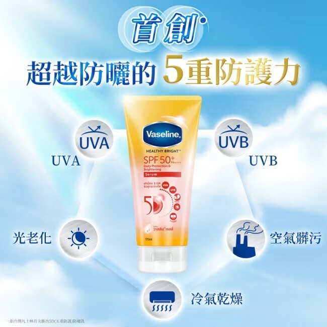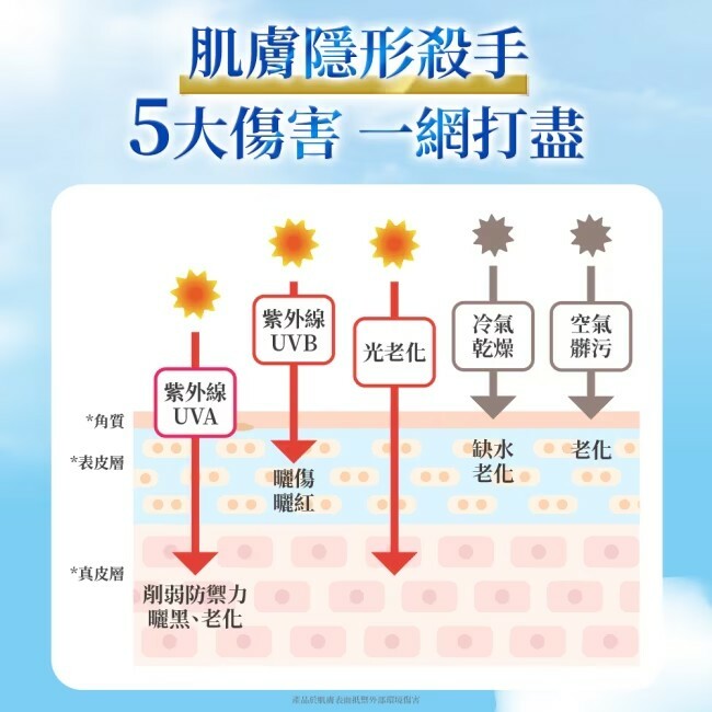 有效抵禦UVA、UVB、空氣髒污、光老化與冷氣乾燥全面打擊5大肌膚傷害。
