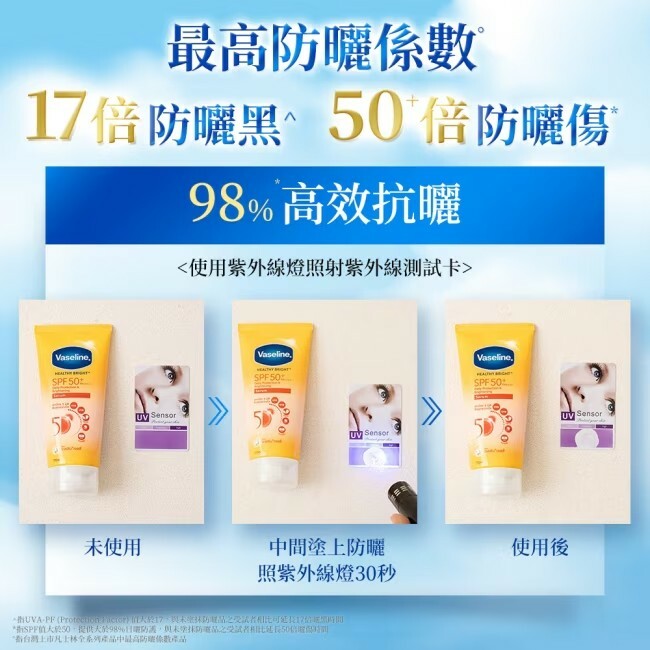 全波段~阻隔紫外線達17倍防曬黑^ 、50+倍防曬傷預防曬後斑點、細紋、光老化等問題高效抵禦98%日照帶來的傷害*。