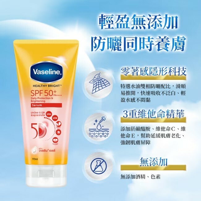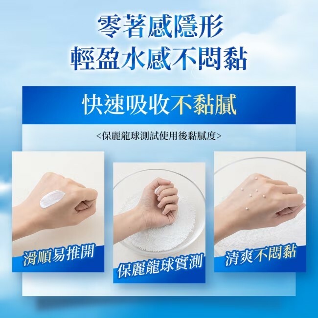 特選水油雙相防曬成份滑順易推開快速吸收不泛白、輕盈水感不悶黏