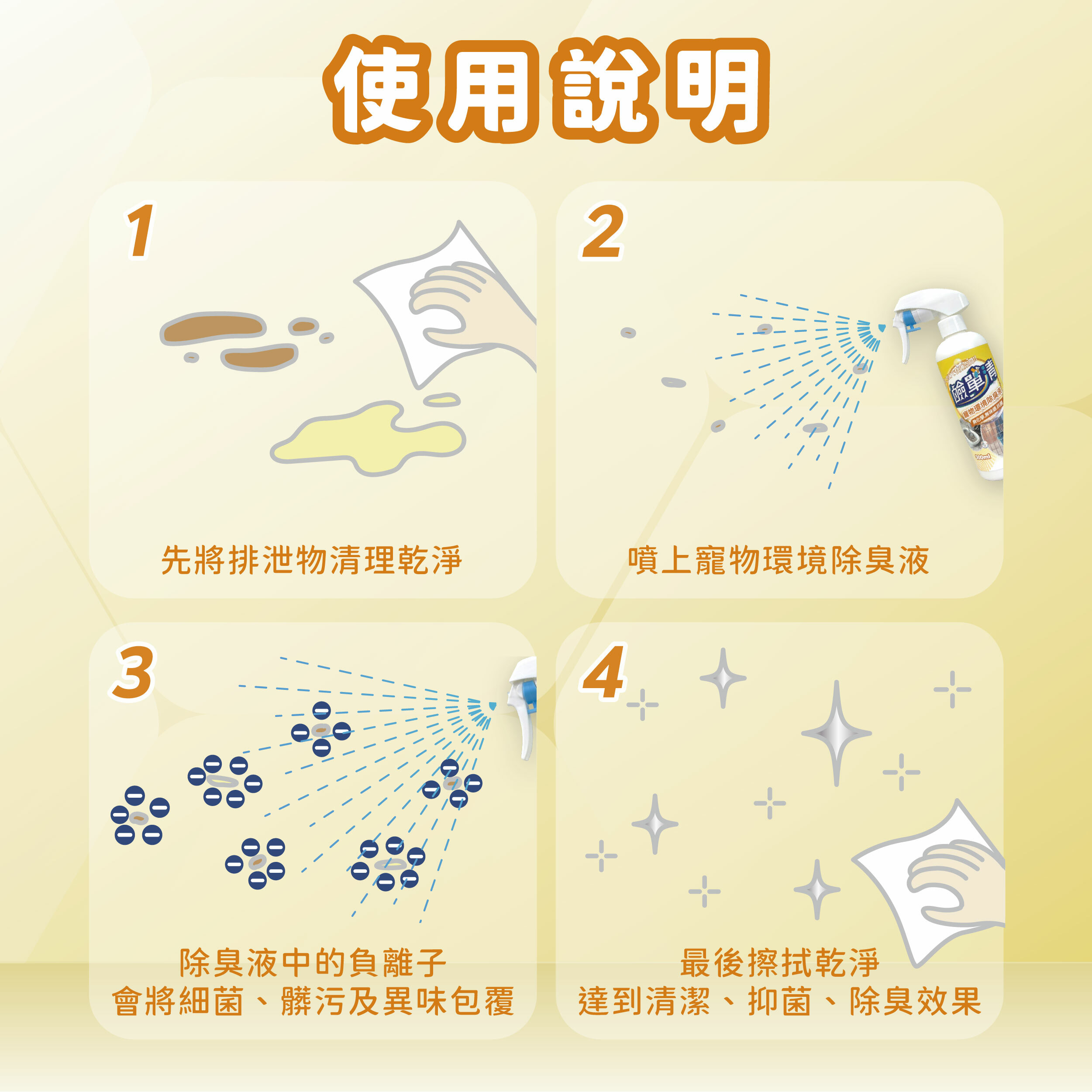 - 噴灑於欲清潔之表面後擦拭乾淨即可