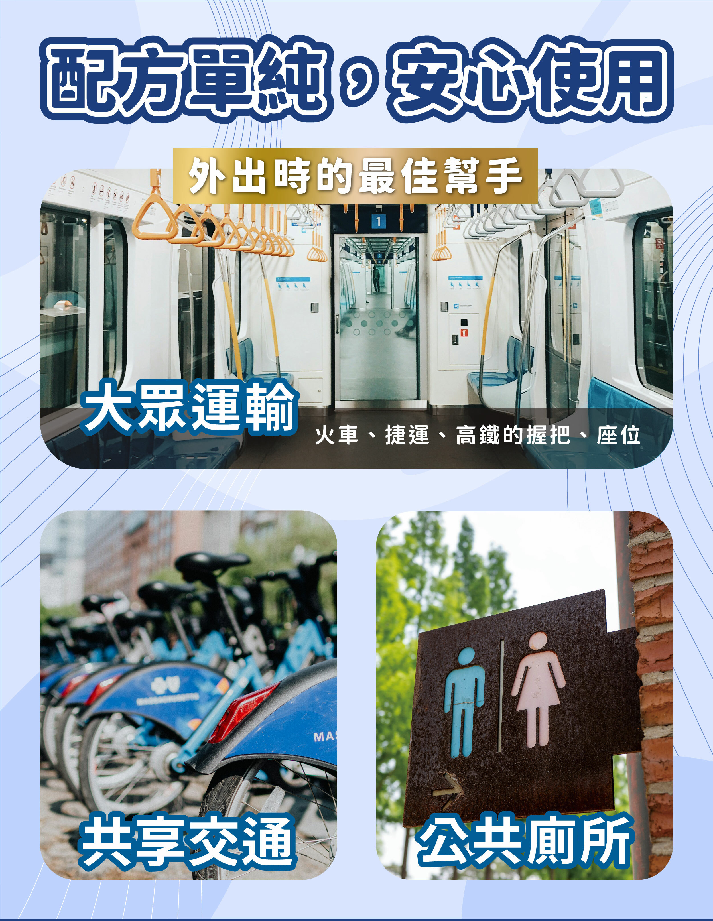 - 公共空間(大眾運輸系統、餐廳、洗手間、辦公室、公共設施等髒污處)