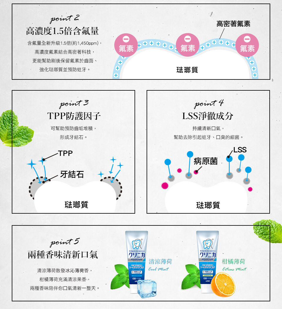 ✔ LSS淨澈成分:持續清新口氣,幫助去除引起蛀牙、口臭的細菌。