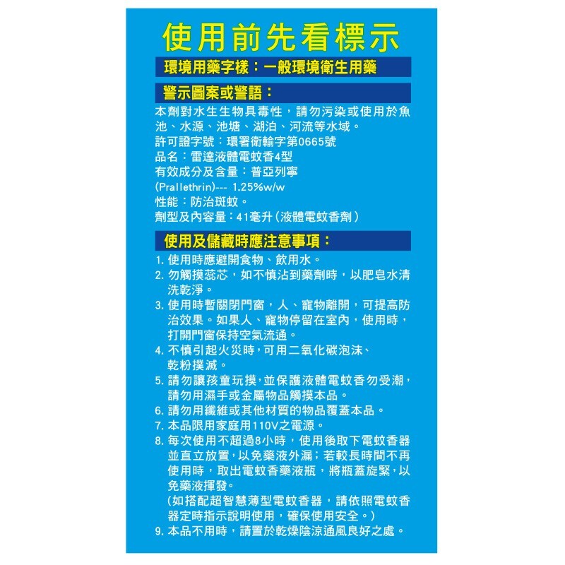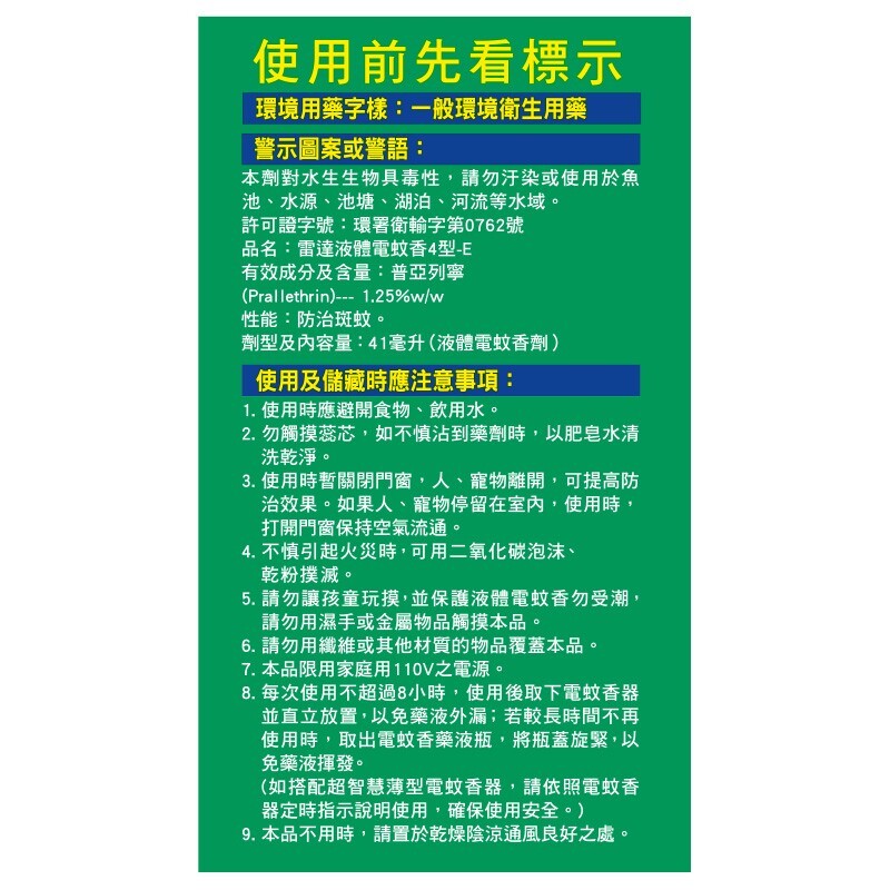 .請置於陰涼處且存放於孩童不易觸及之處,並保護液體電蚊香不受潮,勿以濕手或金屬物品接觸本產品