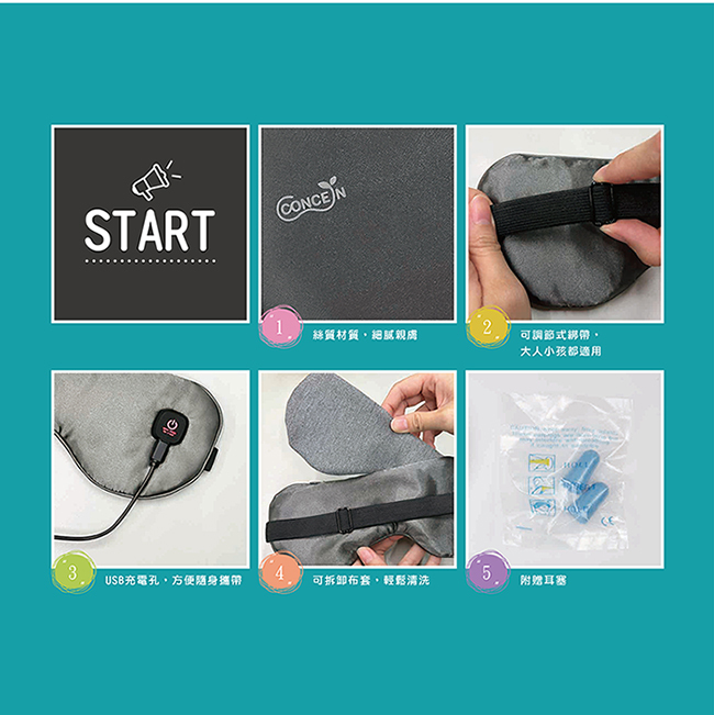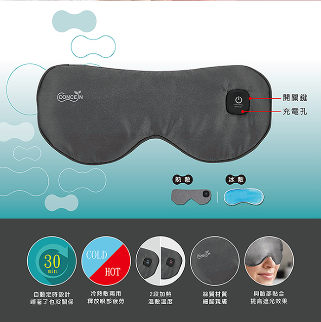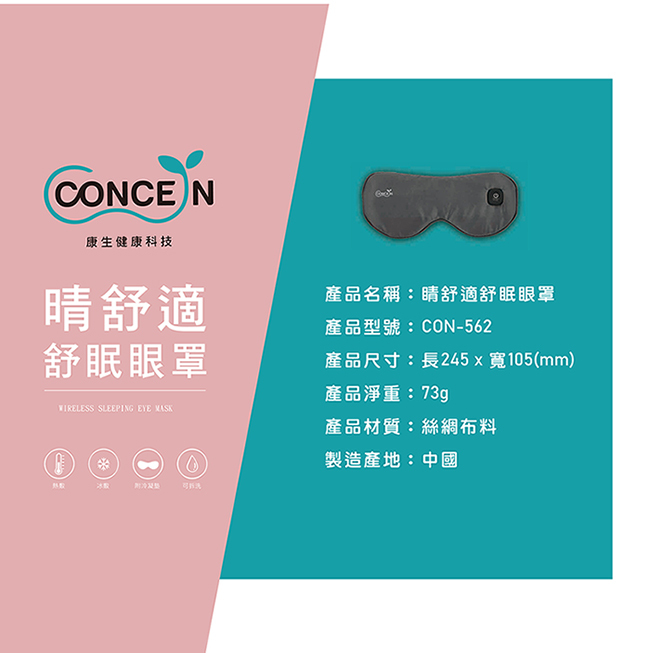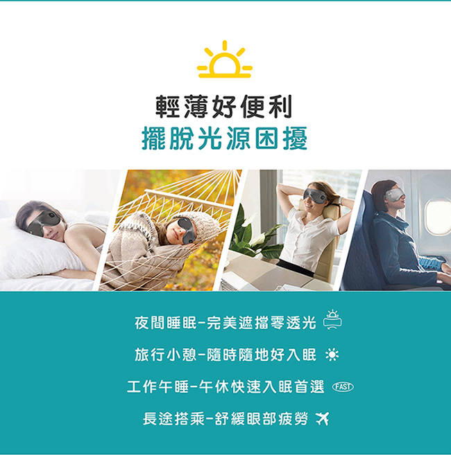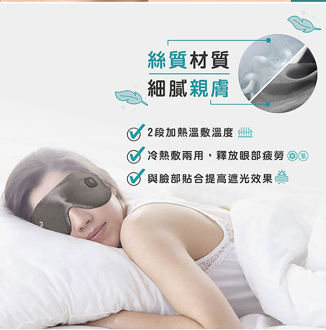 產品配件:眼罩、耳塞、冷凝墊、薰衣草香片、加熱墊、電源線、說明書(含保卡)