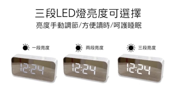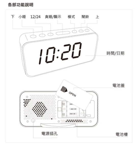 ✔ 自動切換時間顯示、日期顯示、鬧鐘顯示功能(DC供電模式下有此功能)。