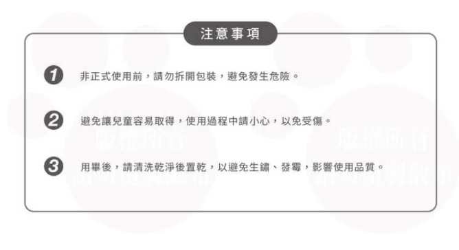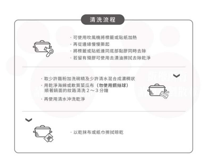 ▶ 新品使用前請以水和麵粉與洗碗精清洗,去除殘留油漬,用畢後請置乾