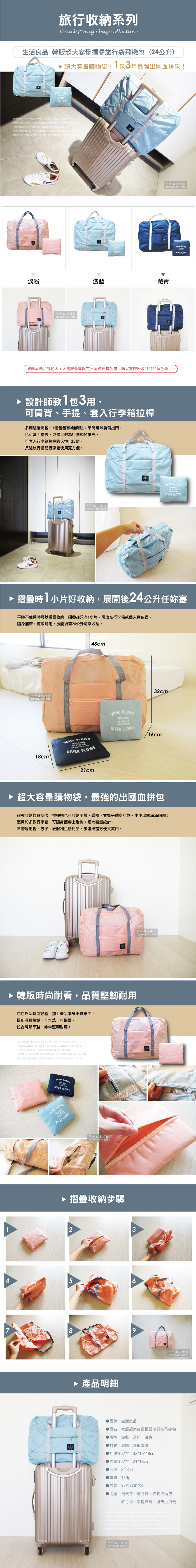 ●品名:韓版超大容量摺疊旅行袋飛機包 (24公升)