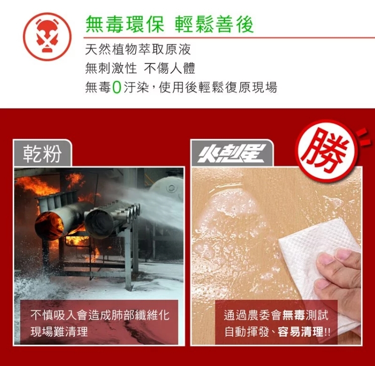 ✔採用天然環保藥劑,噴射時產生高分子泡沫,以冷卻、降溫、阻燃、覆蓋快速滅火,不復燃。