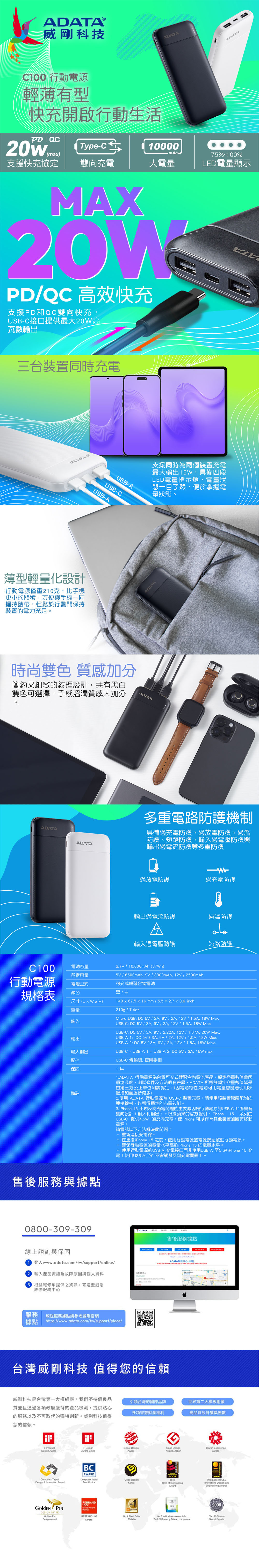 【威剛】C100 10000mAh 20W 3孔 薄型輕量化設計 PD/QC極速快充行動電源(雙向TYPE-C)