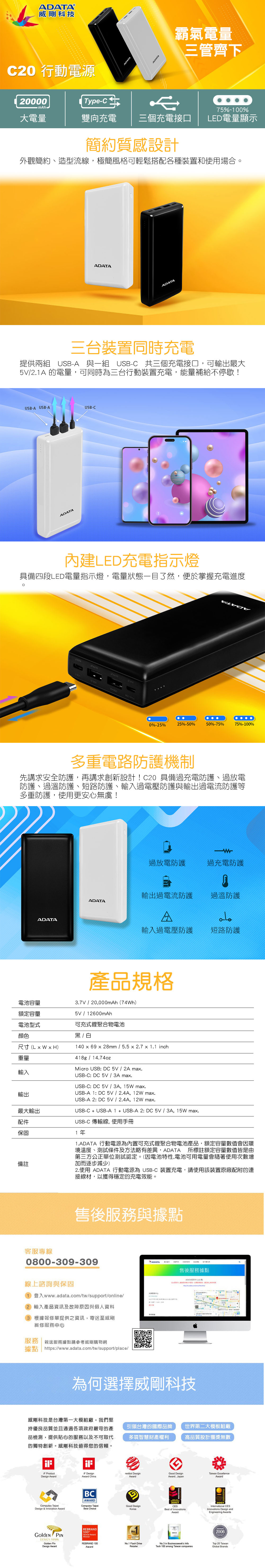 ⭐三台裝置同時充電(USB-A*2+USB-C*1)