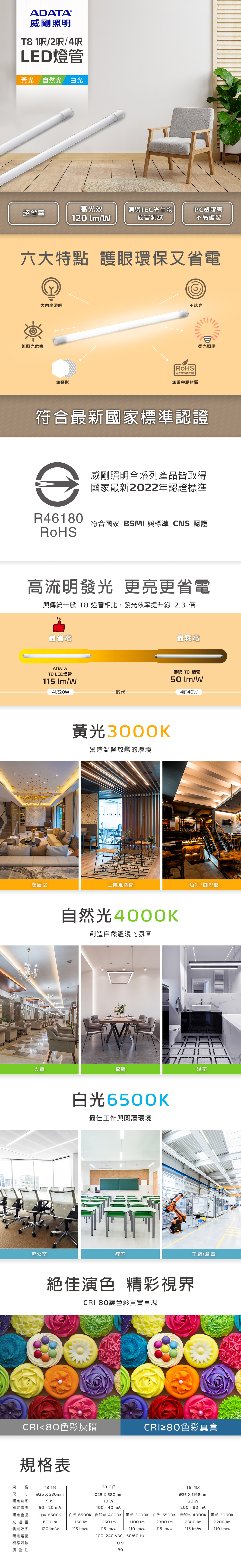 【威剛照明】T8-10W 2尺 LED 燈管 / 白光 (1150流明) 10隻/箱