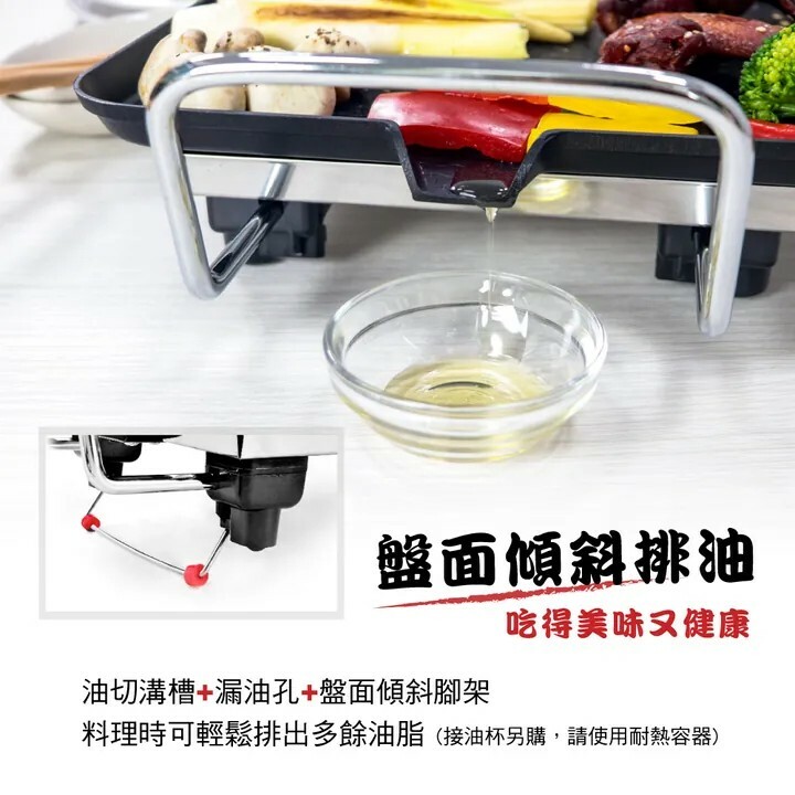 ✔油切溝槽、漏油孔、盤面傾斜腳架設計,料理時可輕鬆排出多餘油脂,少油無煙更健康