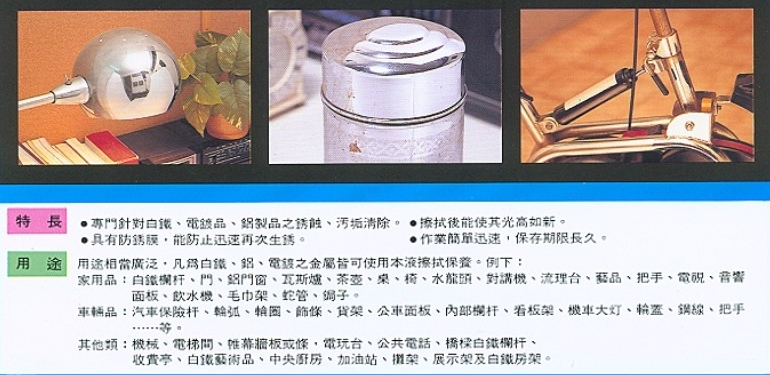 ✔針對不銹鋼電鍍品、鋁製品之污垢銹蝕清除劑,具有防銹膜及亮光作用,非強腐蝕性產品。