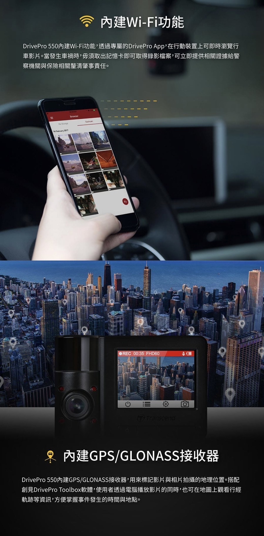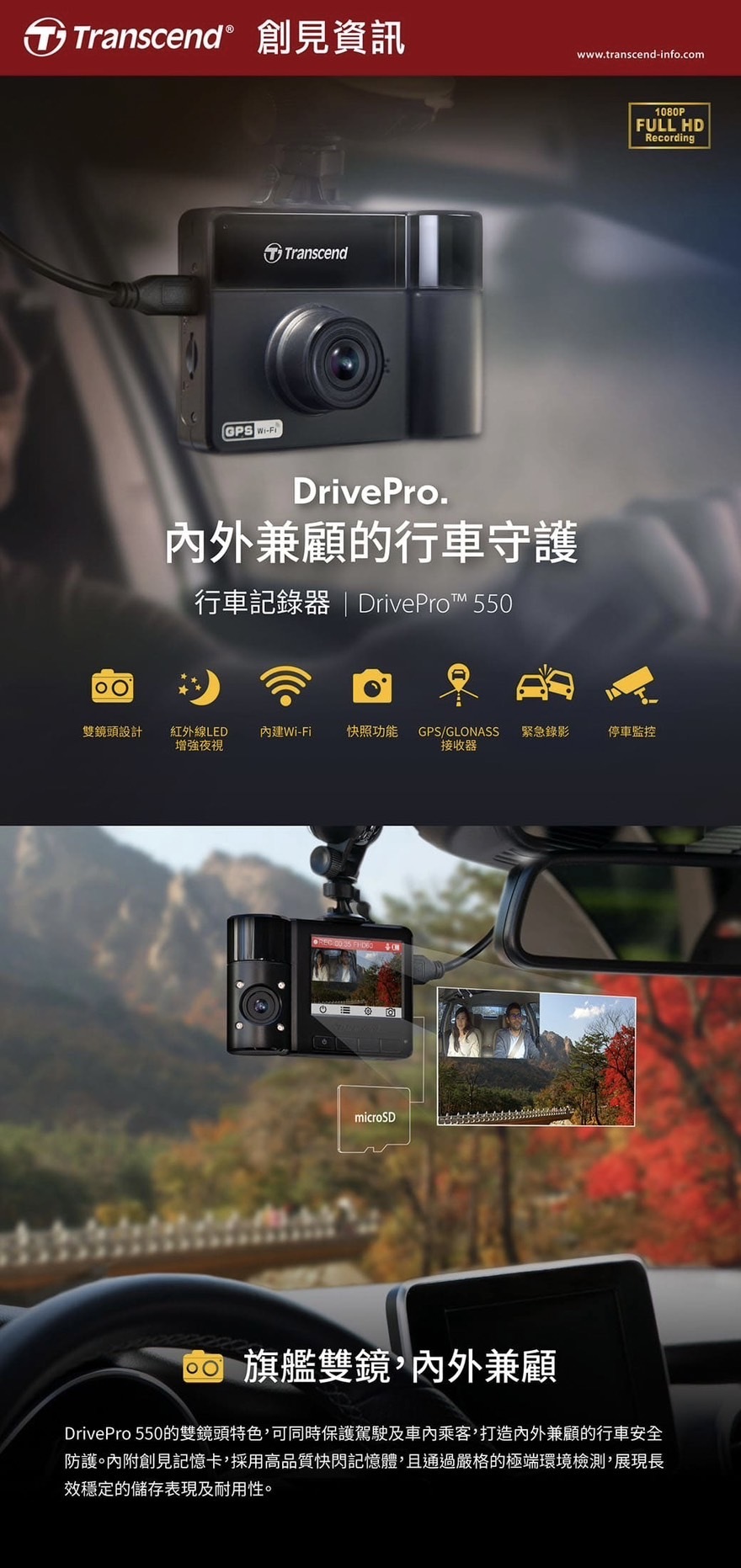 【創見】DrivePro 550 / Wi-Fi +GPS/車前、內 雙鏡頭 行車記錄器/64G