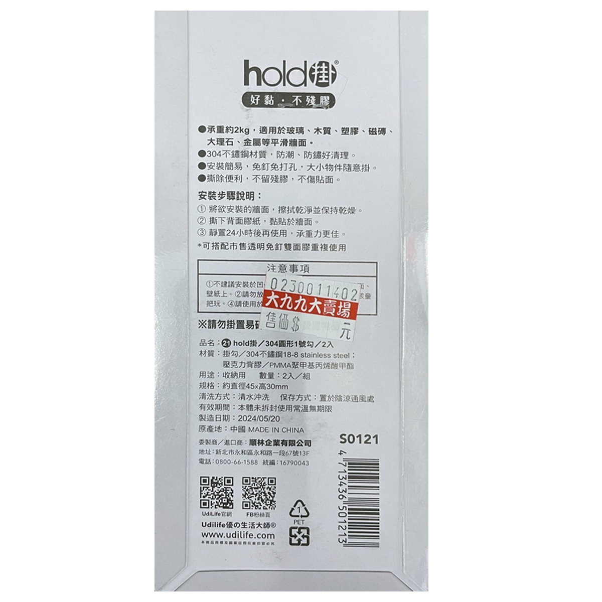 【UdiLife 優の生活大師】hold掛 304圓形1號勾 S0121 (2入)