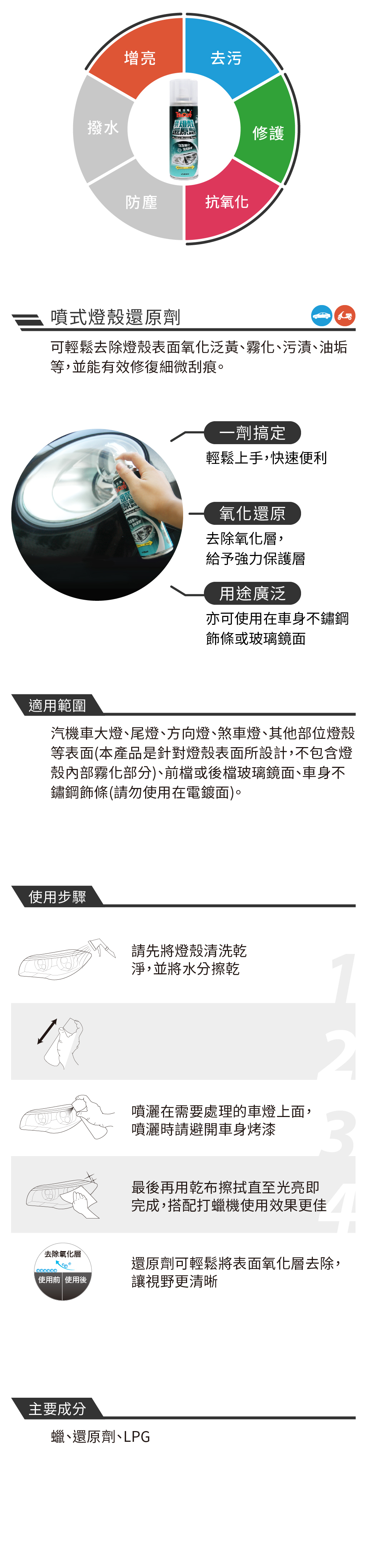 ✔可輕鬆去除燈殼表面氧化泛黃、霧化、污漬、油垢等